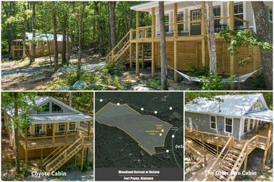 Fort Payne, AL | Two Cabins at Woodland Retreat at DeSoto | Includes Coyote Cabin and The Otter Box Cabin | 92 Acres | Borders DeSoto State Park | Optional No-Stairs Entrances | Fast Wi-Fi | Gas Log Fireplaces | Double Hammocks | BBQ Grills | Fire Pits | Dog Friendly | Hosts up to 12 Guests